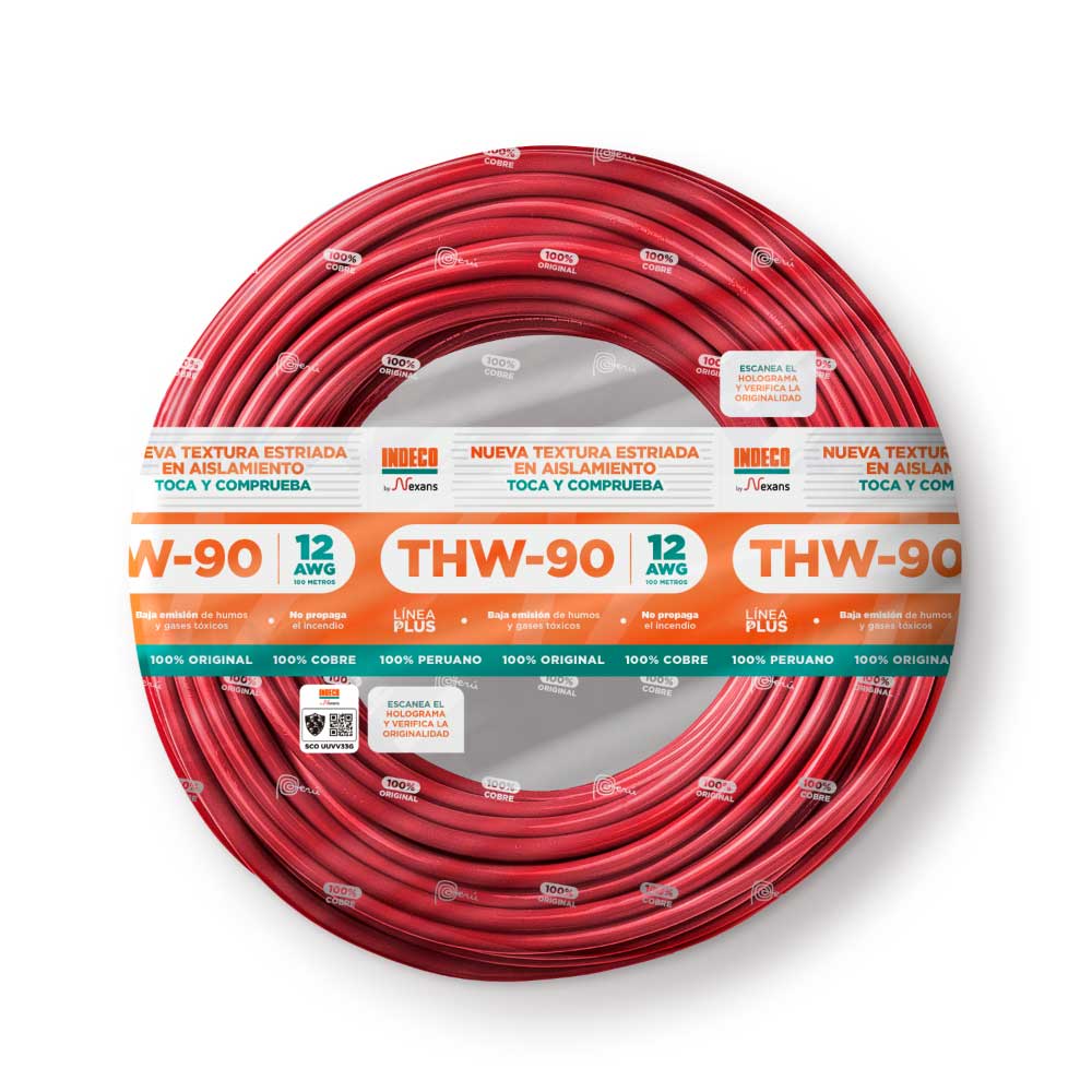 - Cable THW-90 +plus 450/750 V 12 AWG Rojo 100m Indeco.