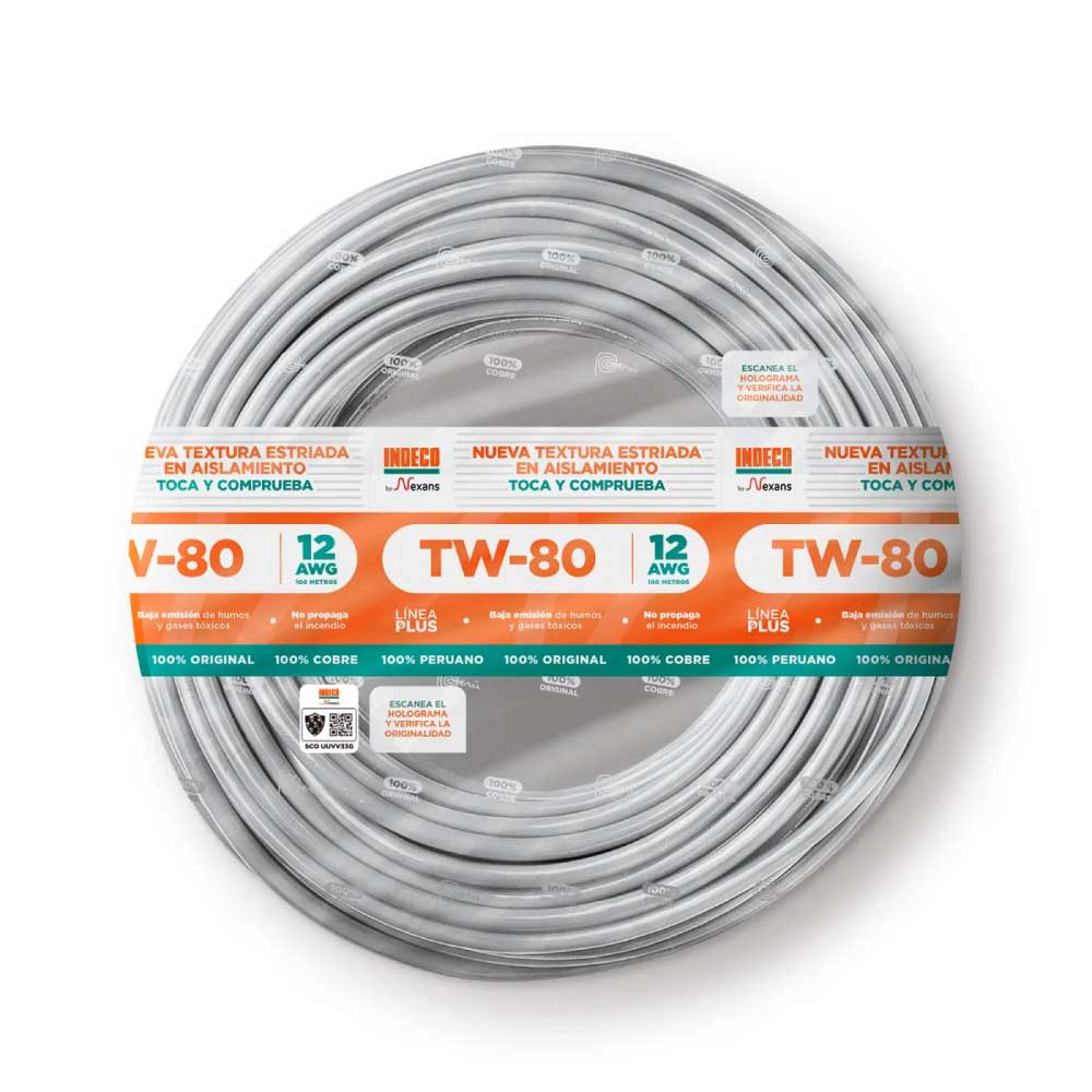 - Cable TW-80 +plus 450/750 V 12 AWG Blanco 100m Indeco.